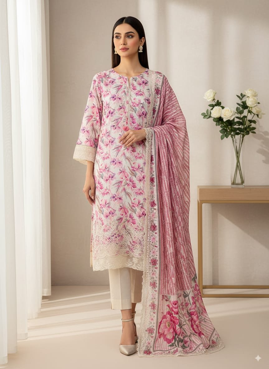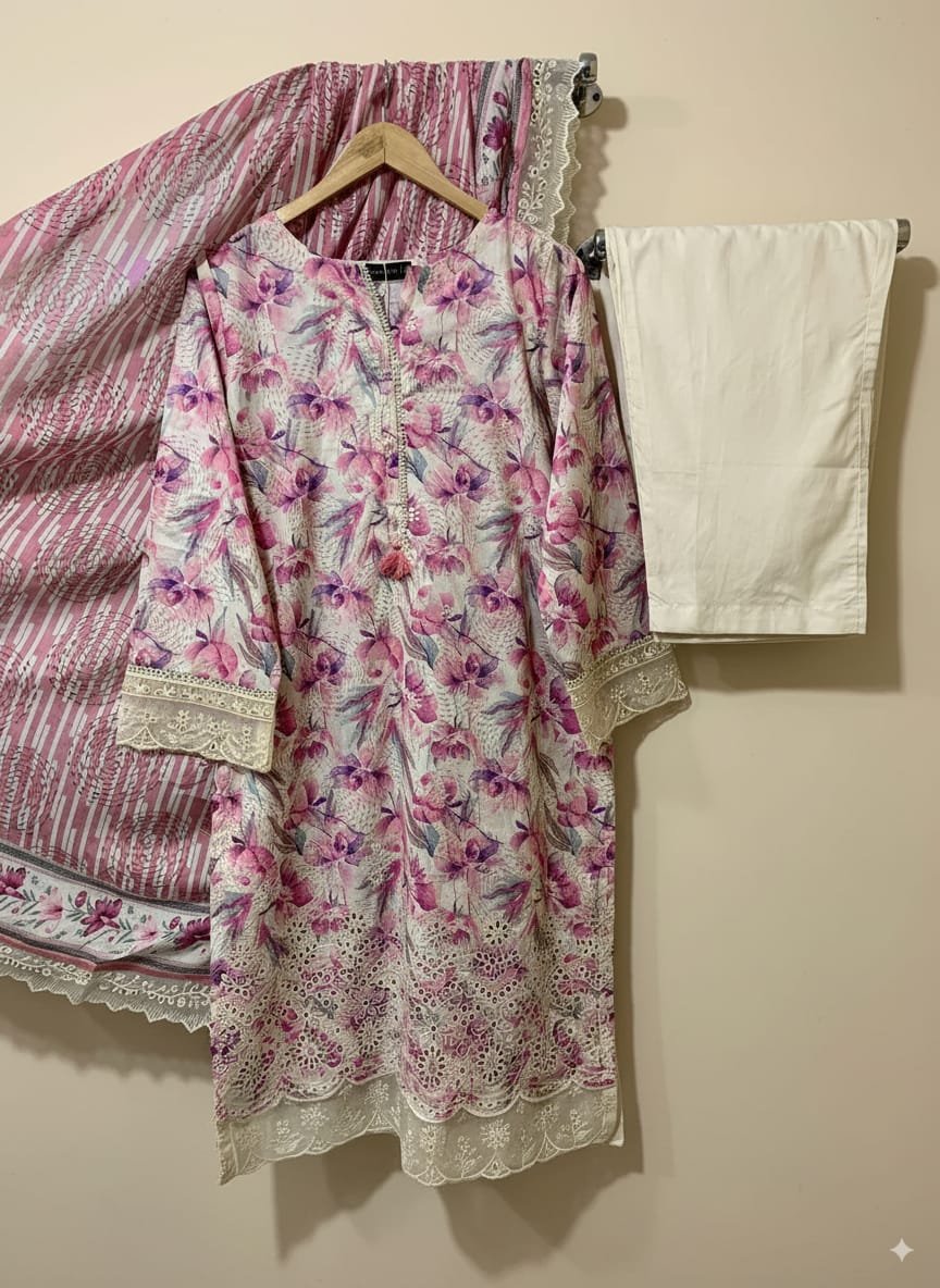 Elegant stitched 3-piece suit featuring a chikankari embroidered lawn shirt, embroidered lawn dupatta, and dyed plain trouser. Available in Small, Medium & Large at an exclusive price. Limited stock—order now!