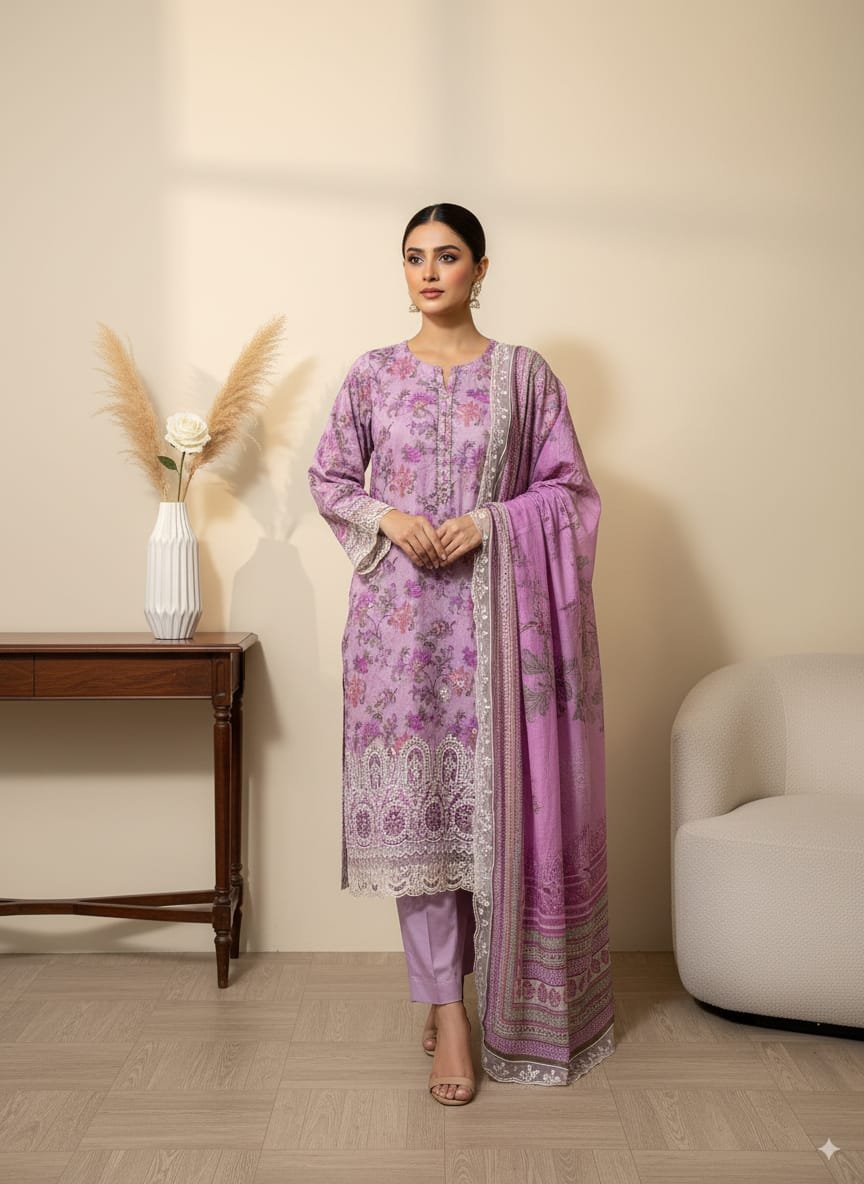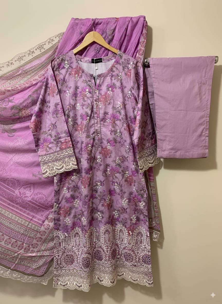 Elegant stitched 3-piece suit featuring a chikankari embroidered lawn shirt, embroidered lawn dupatta, and dyed plain trouser. Available in Small, Medium & Large at an exclusive price. Limited stock—order now!